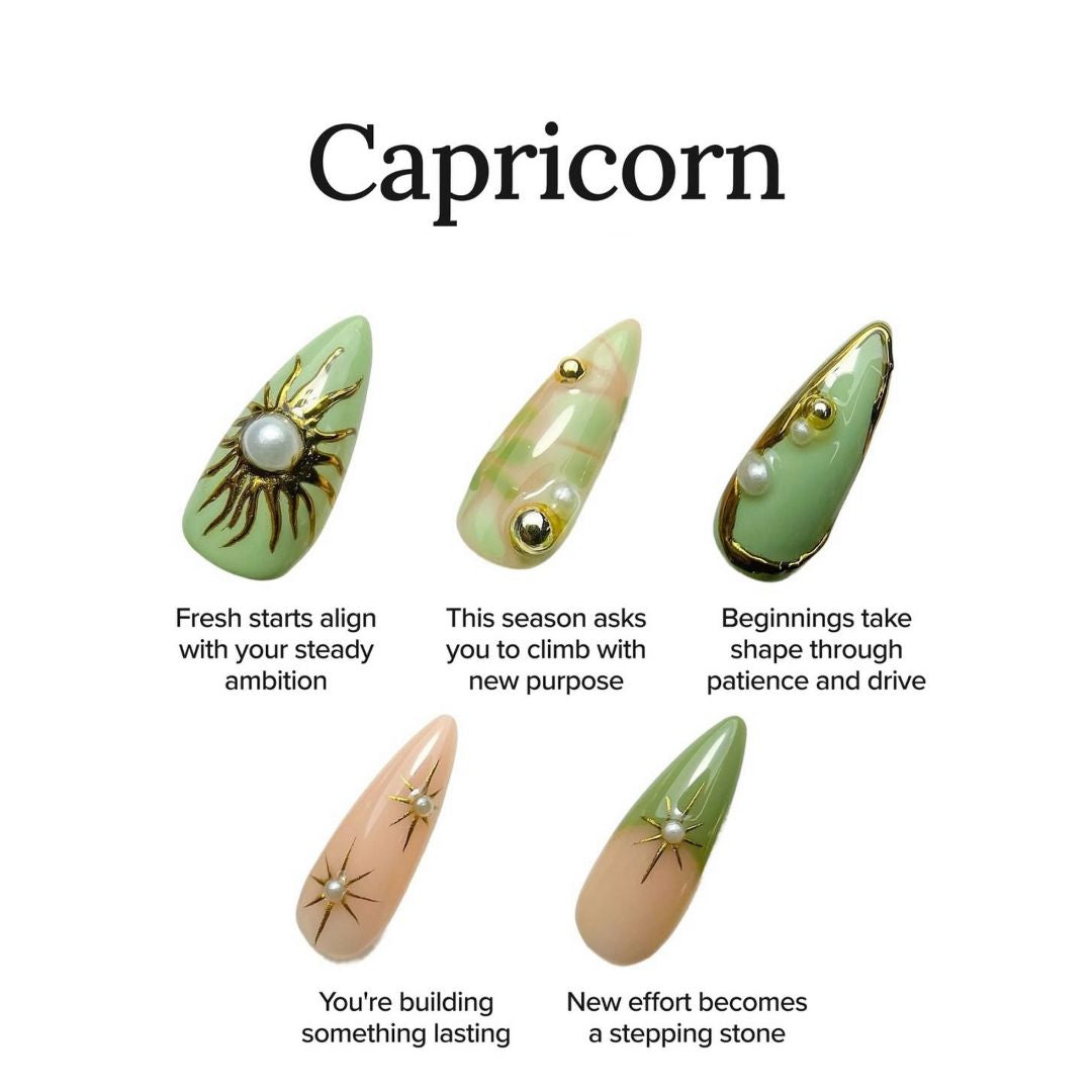 Lris Nails – Grounded in earthy tones and pearl accents, this Capricorn-inspired set honors discipline, ambition, and subtle strength. With golden details, sunbursts, and balanced neutrals, each nail is a step toward what you're building—with elegance and intent.