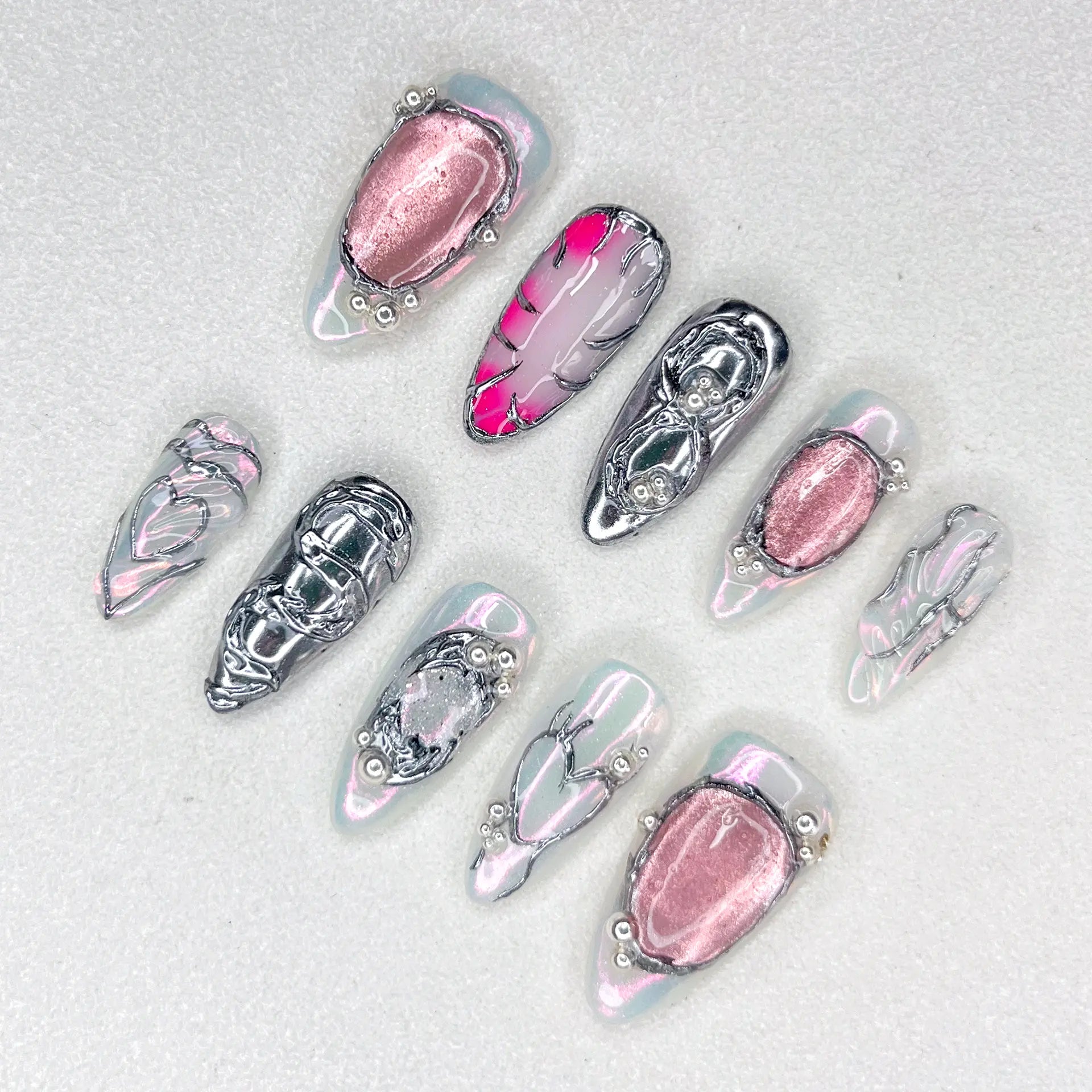 Metal meets blush in this hyper-modern nail set designed for the digital femme. With reflective silver wires, soft pink chrome finishes, and 3D liquid forms that hug each tip, this set is a fusion of dystopian edge and holographic romance.