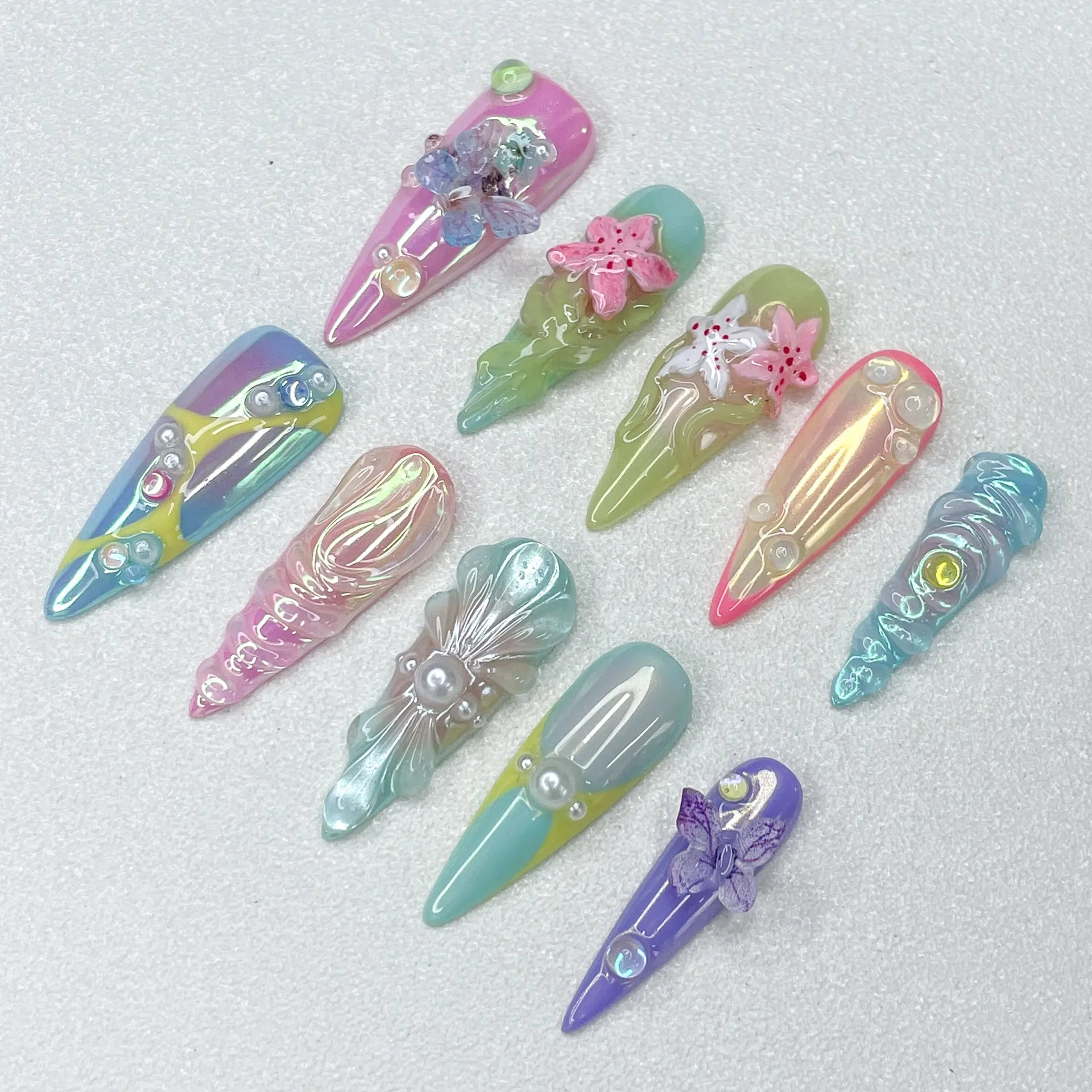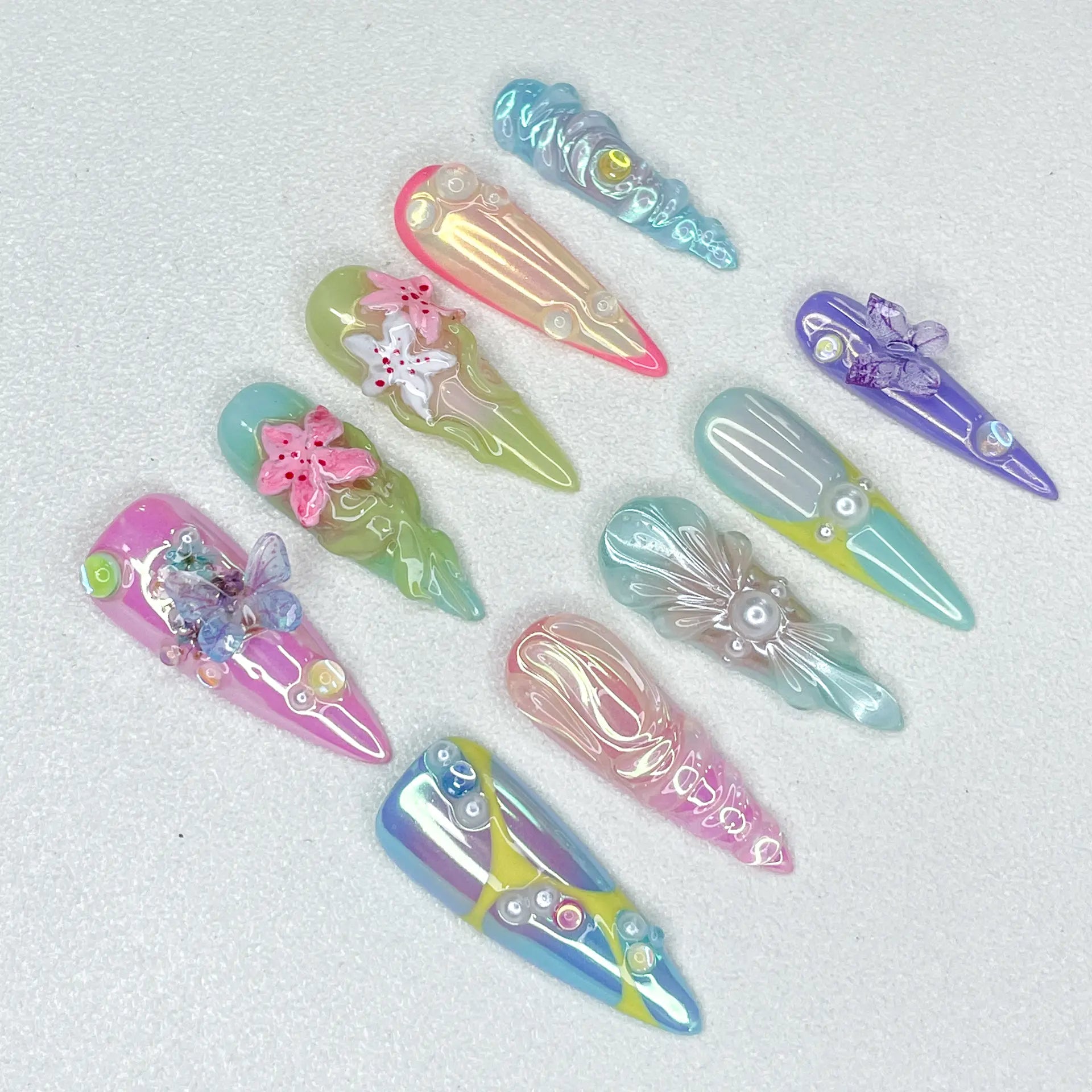 Lris Nails – Step into a euphoric garden of pastels and playful textures with Dopamine Bloom. Featuring glossy candy gradients, dreamy butterflies, sculpted florals, and luminous pearl details, this set turns your nails into a technicolor daydream. Sweet, surreal, and made to spark joy.