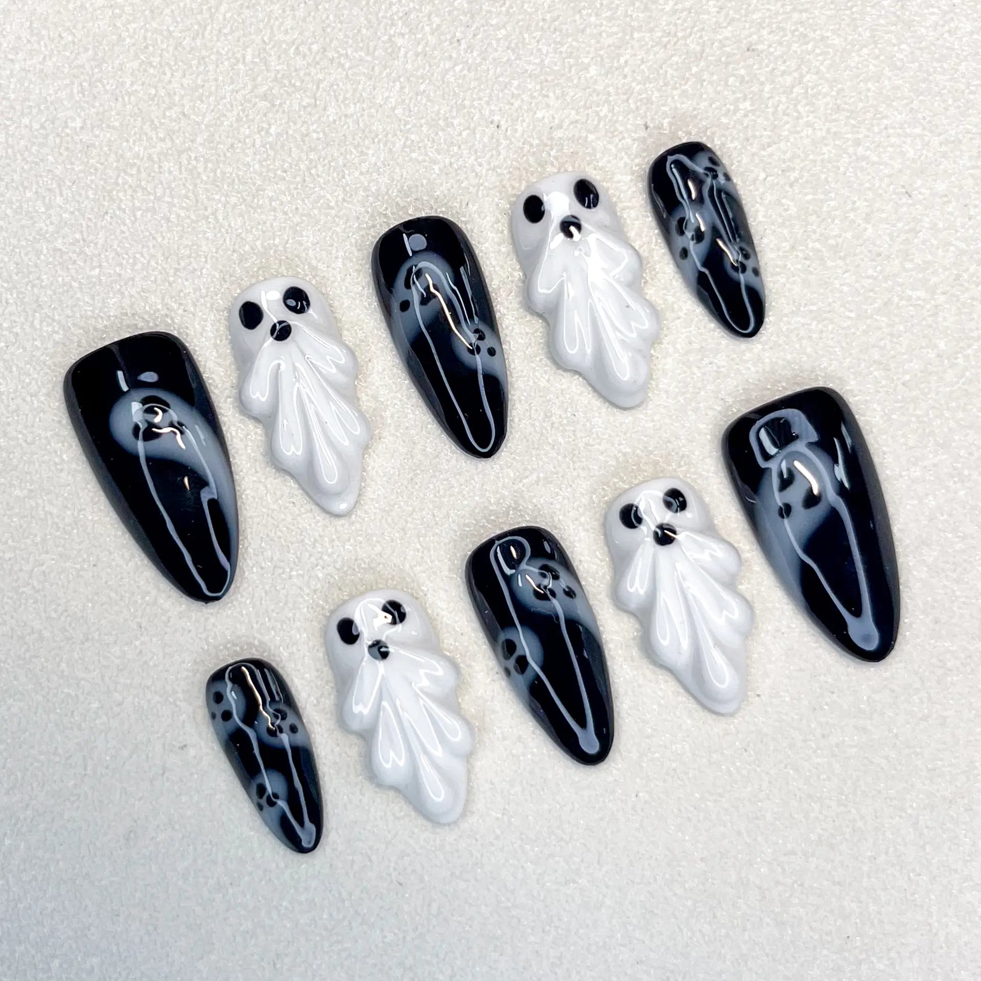 Each nail features glossy black and white tones with hand-sculpted 3D ghost details, balancing eerie charm with a touch of modern elegance.