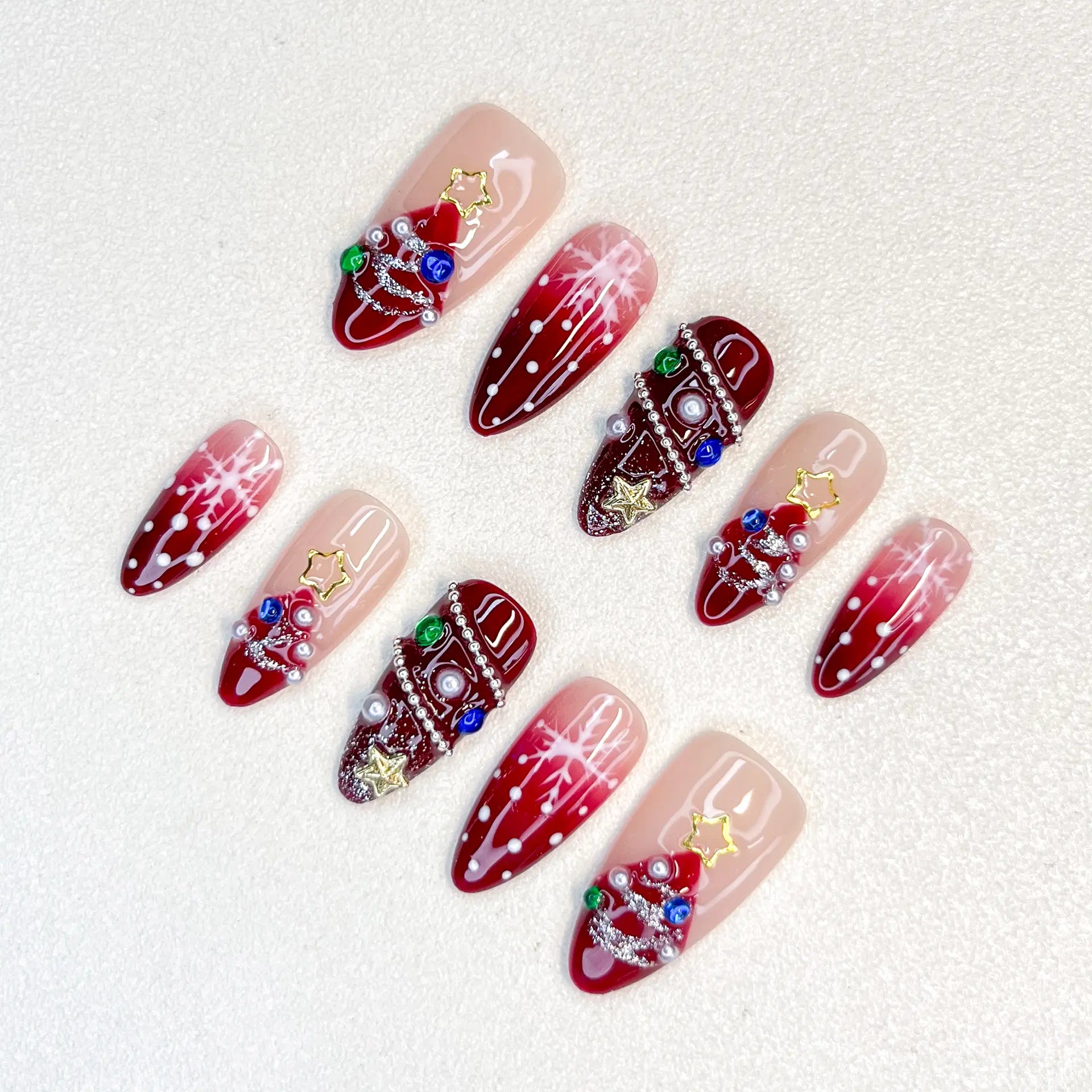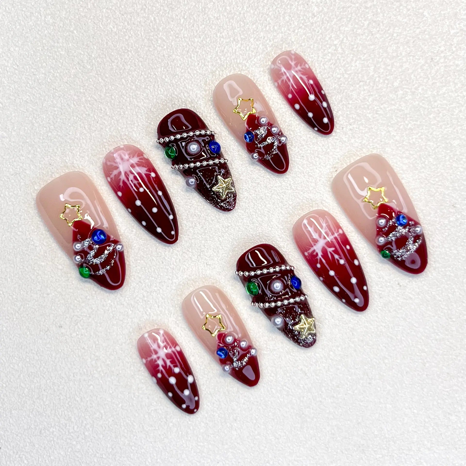This press-on nail set captures the magic of Christmas with gradient reds, shimmering snowflakes, 3D ornaments, and tiny Christmas trees topped with golden stars. A perfect match for holiday parties and cozy nights.