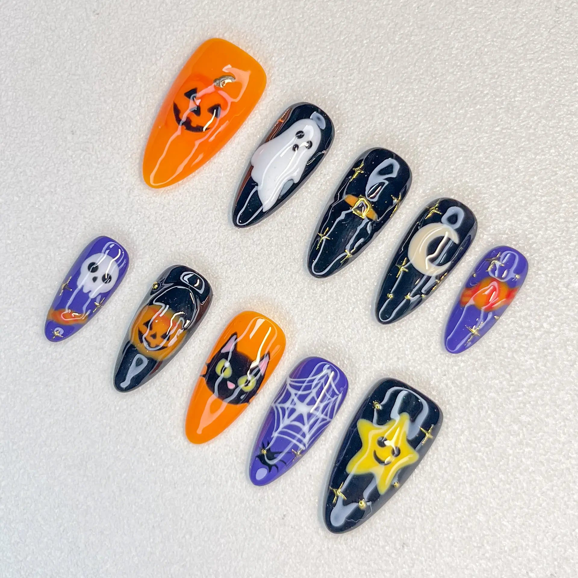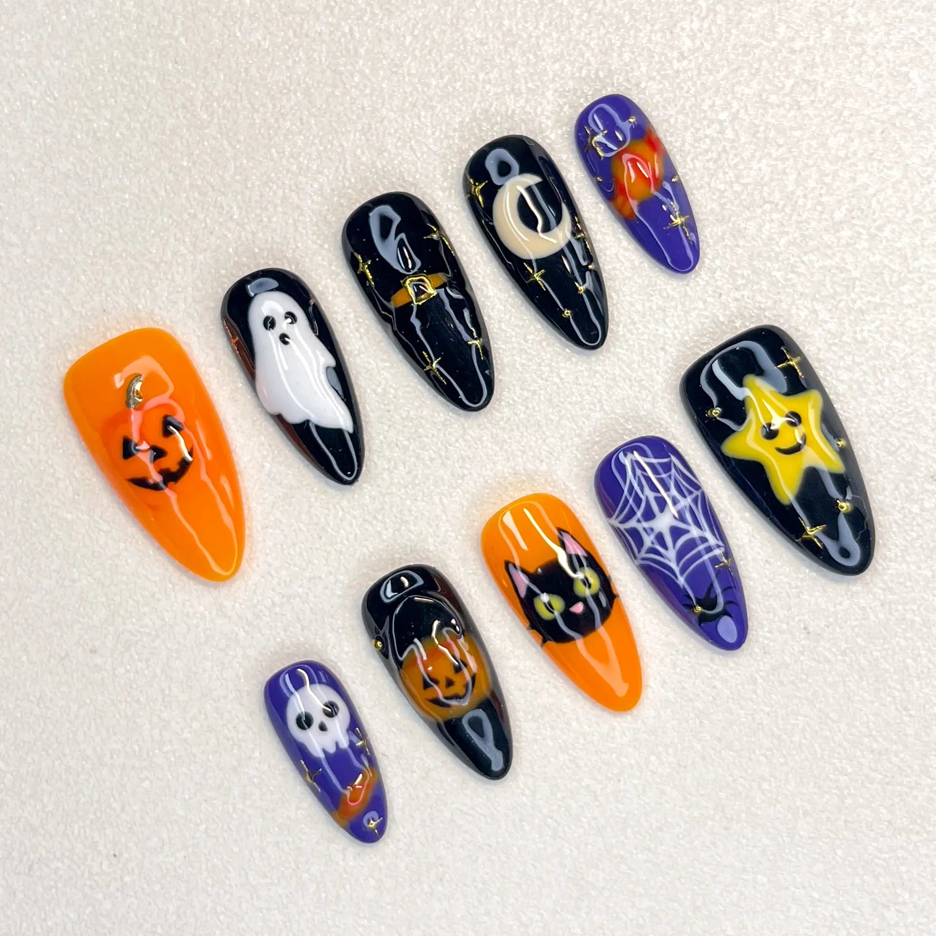 Featuring glowing pumpkins, black cats, ghosts, and twinkling stars, each nail is hand-painted to capture the cozy, mischievous magic of Halloween night.
