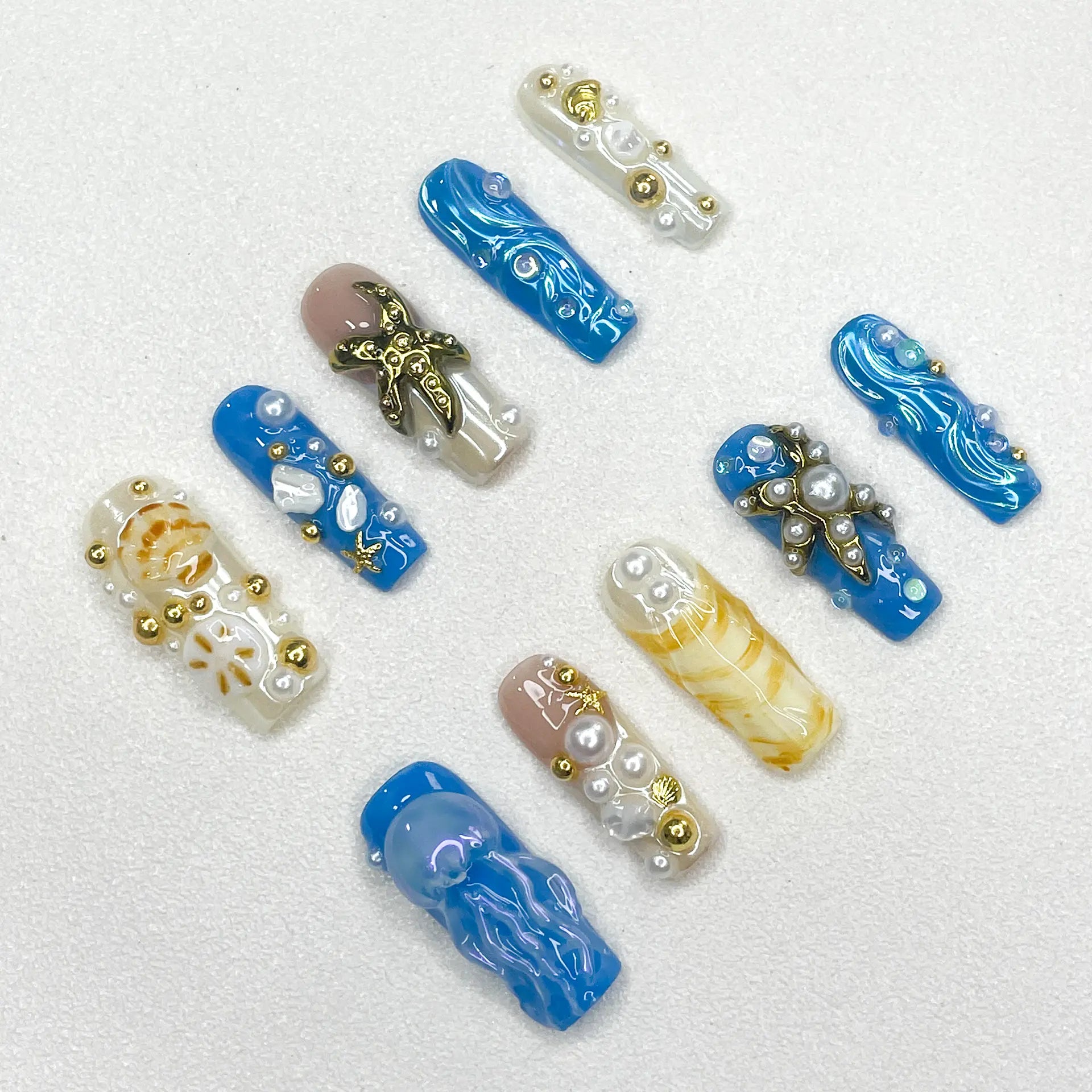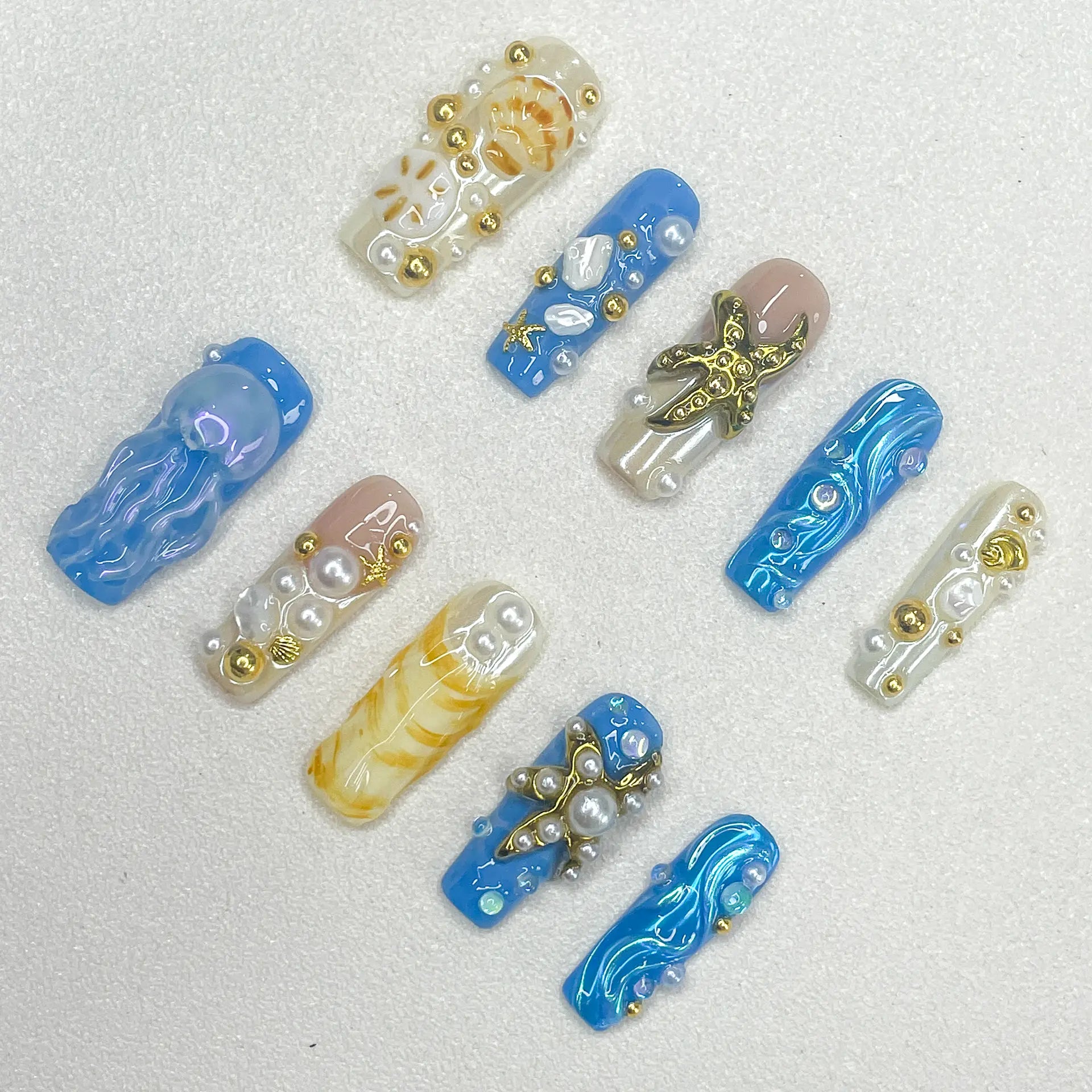 This set features sculpted starfish, seashells, jellyfish, and ocean waves brought to life with pearls, gold accents, and swirls of sandy yellow and deep sea blue. Every nail tells a story — from beach treasures to underwater mysteries.