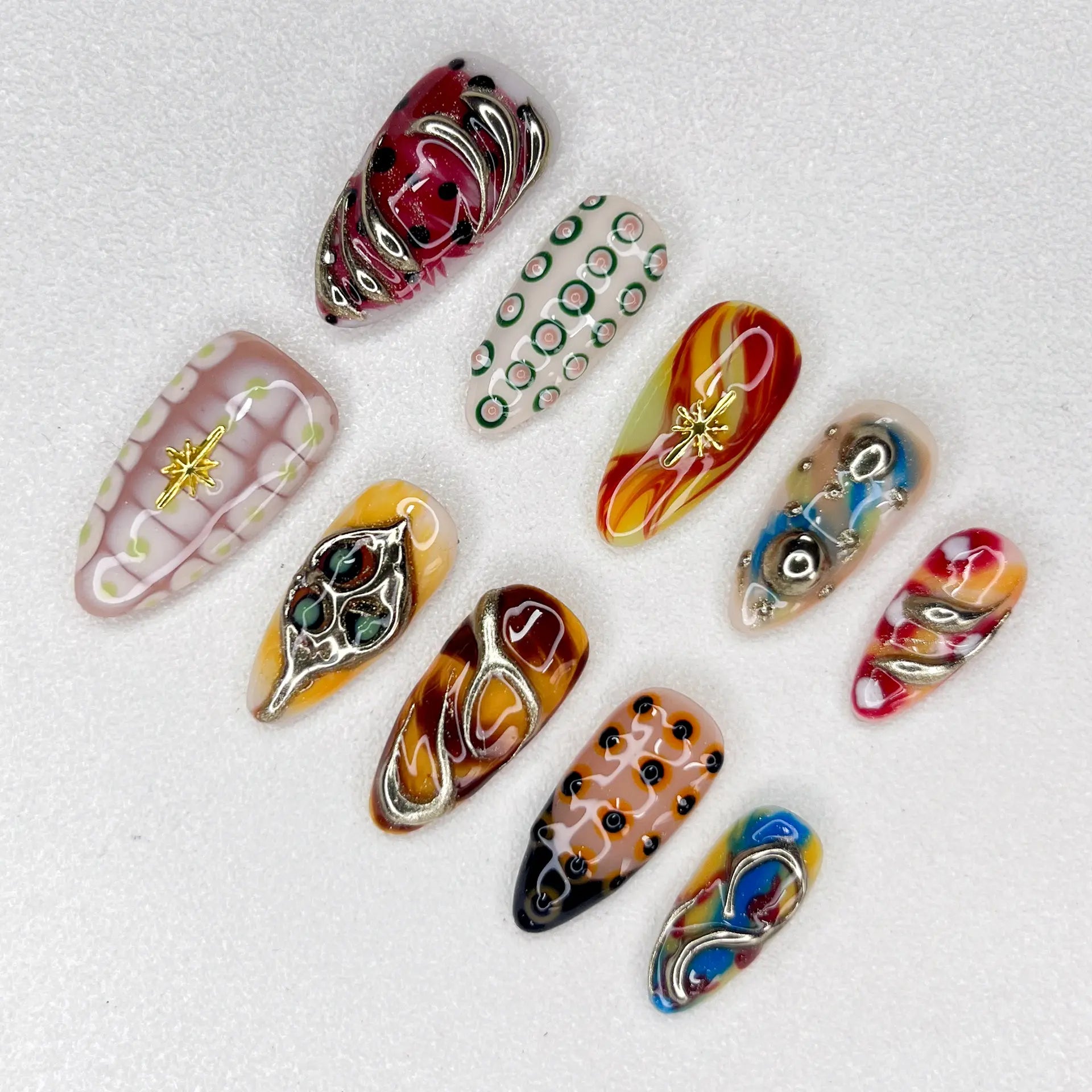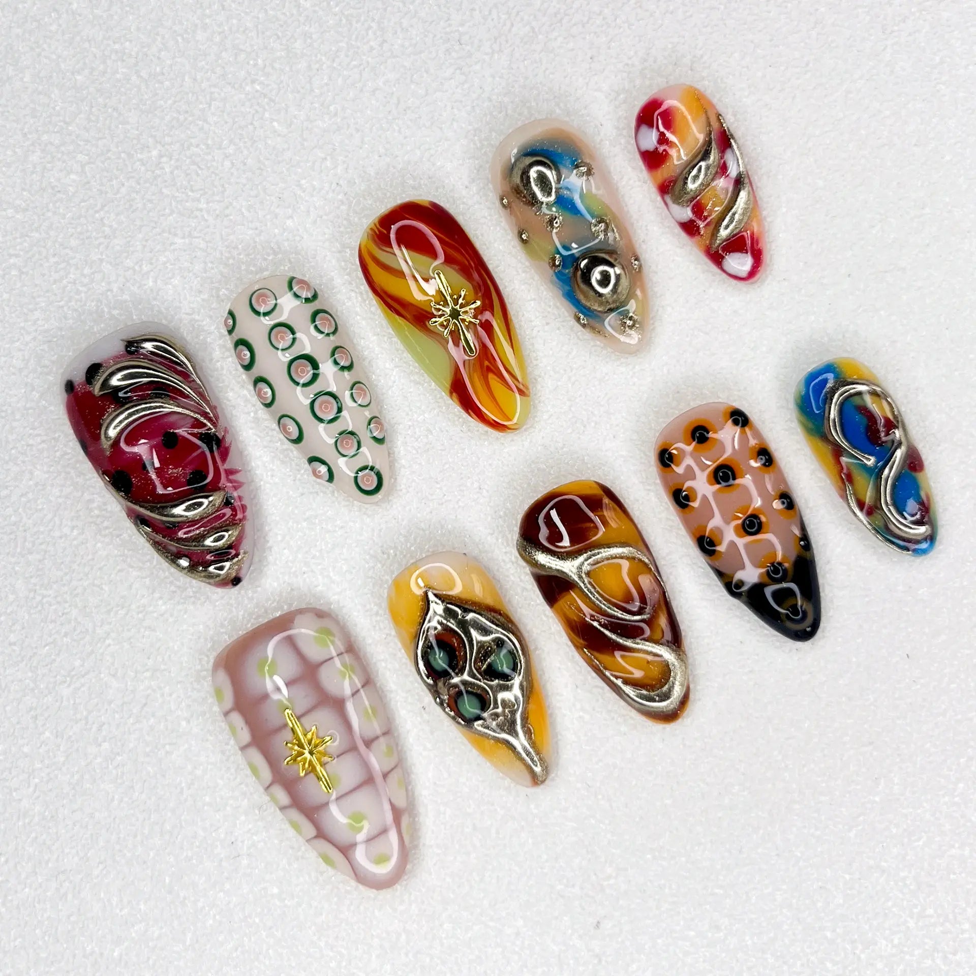 Bold, chaotic, and hypnotic — this nail set is an explosion of psychedelic swirls, fluid chrome patterns, and sensory overload. Each design is uniquely crafted with vibrant retro tones, playful dot grids, and warped 3D lines that twist like a dream.