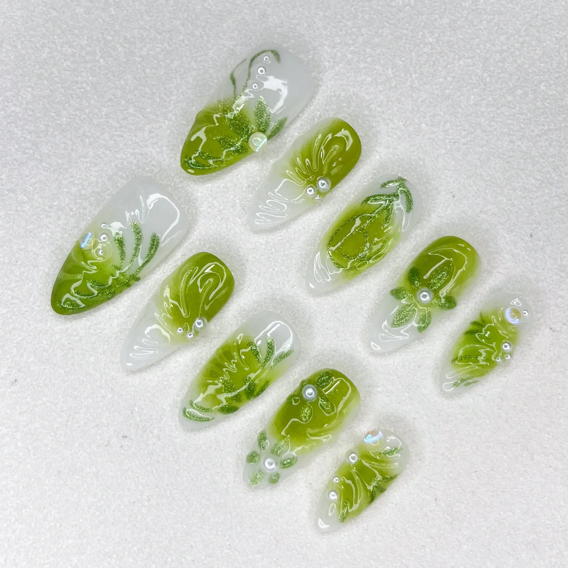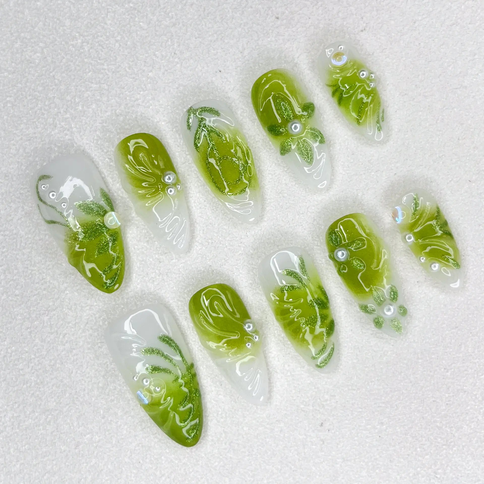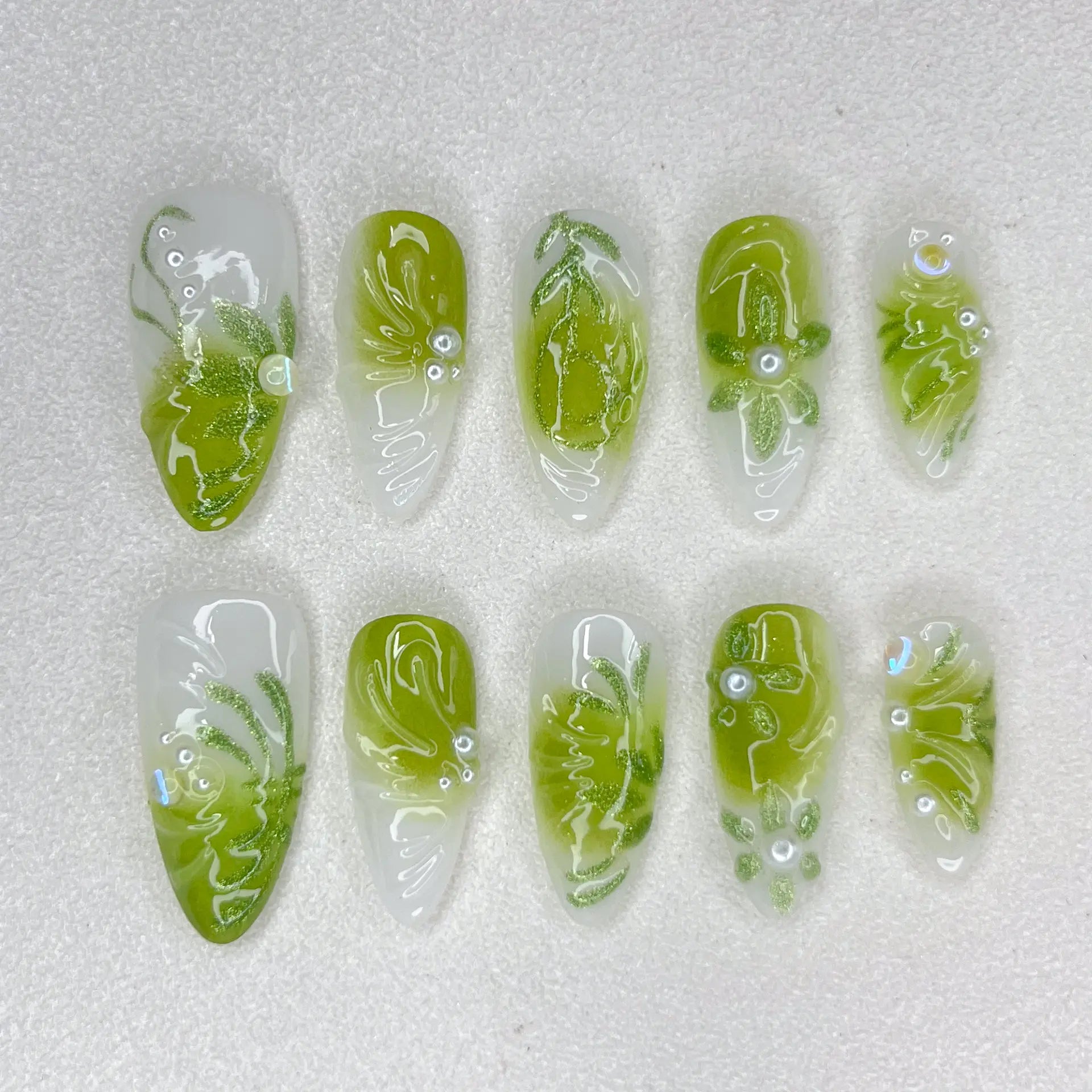 This fresh green and milky white press-on nail set features leaf-like swirl patterns and 3D pearl details, resembling climbing vines kissed by morning dew.