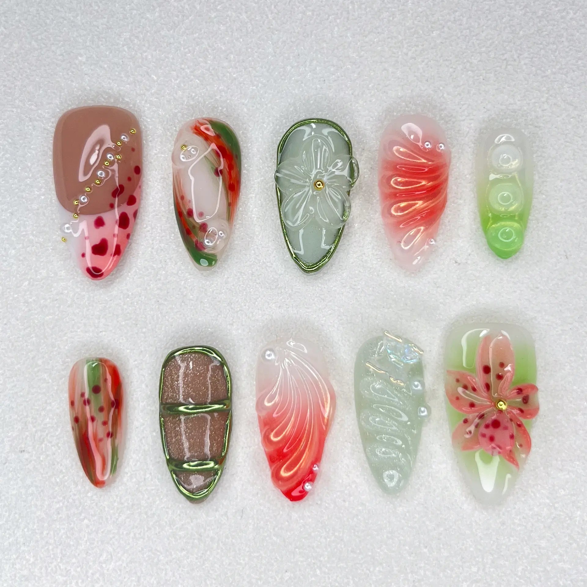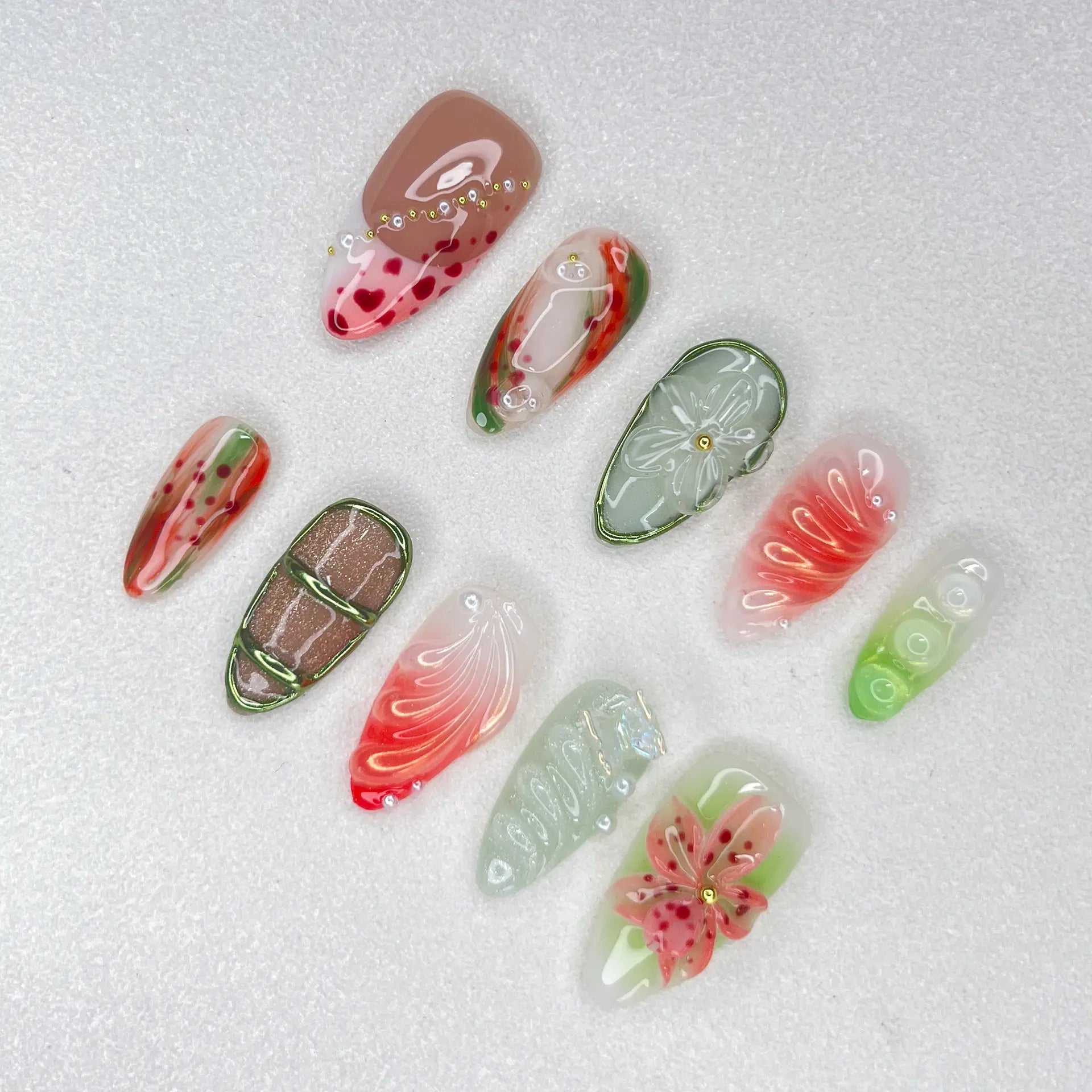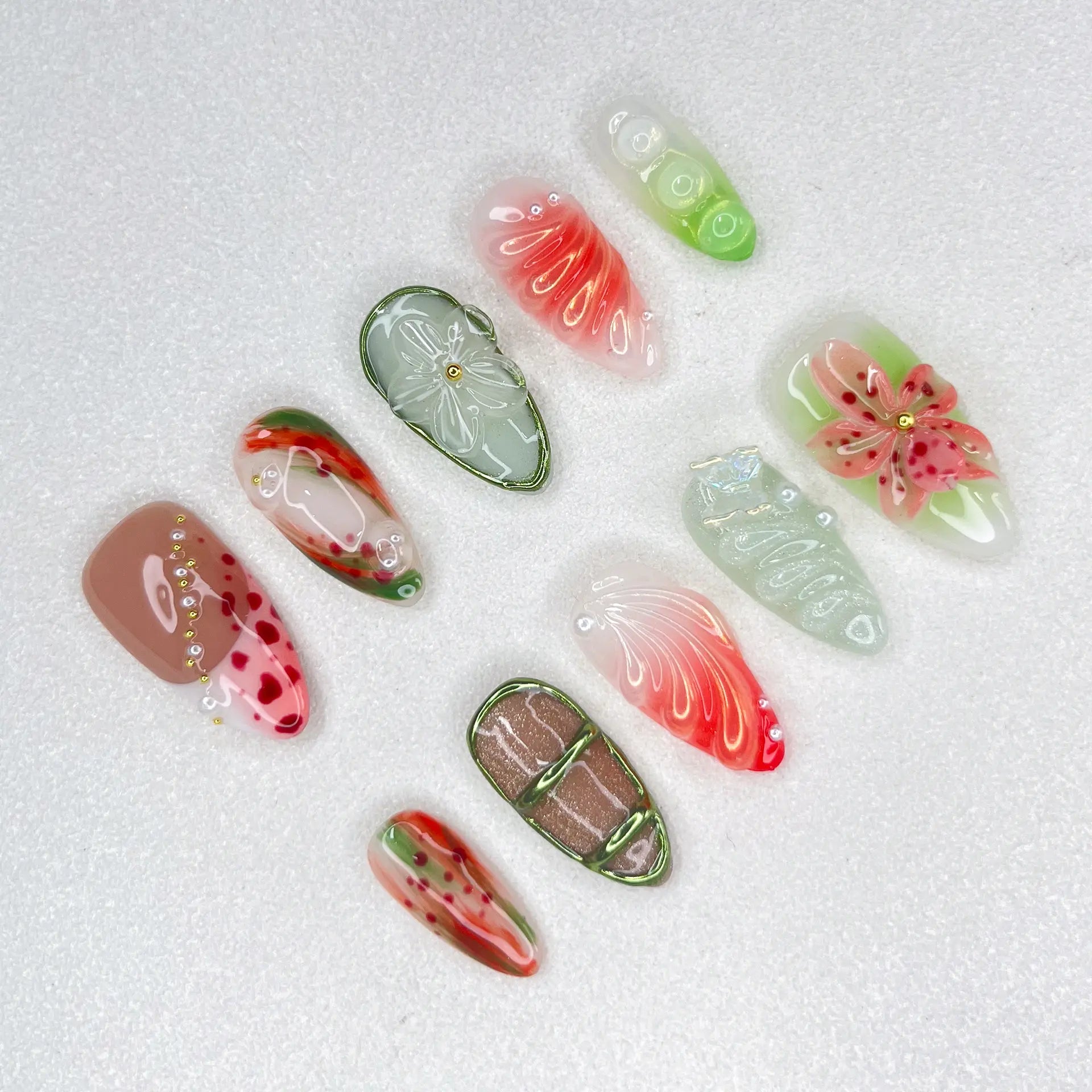 This set blends jelly strawberry reds, creamy greens, and soft whites with whimsical dot detailing and handmade floral textures. Whether you're brunching or blooming, these nails are the perfect pop of fruity fantasy.